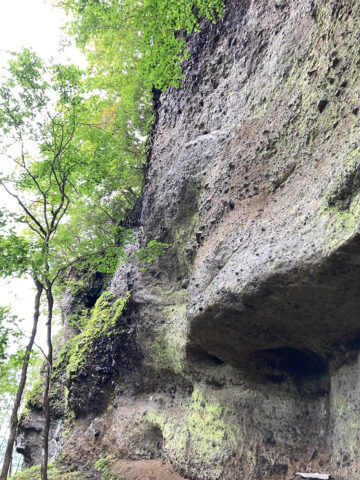 「クレヨンしんちゃん」の作者・臼井儀人さんが、この山の断崖から落ち、遺体で発見されたのは6年前のこと。誤って落ちたのか自殺なのかはわからないらしいが、たしかに断崖から下を望むと吸い込まれそうになる。